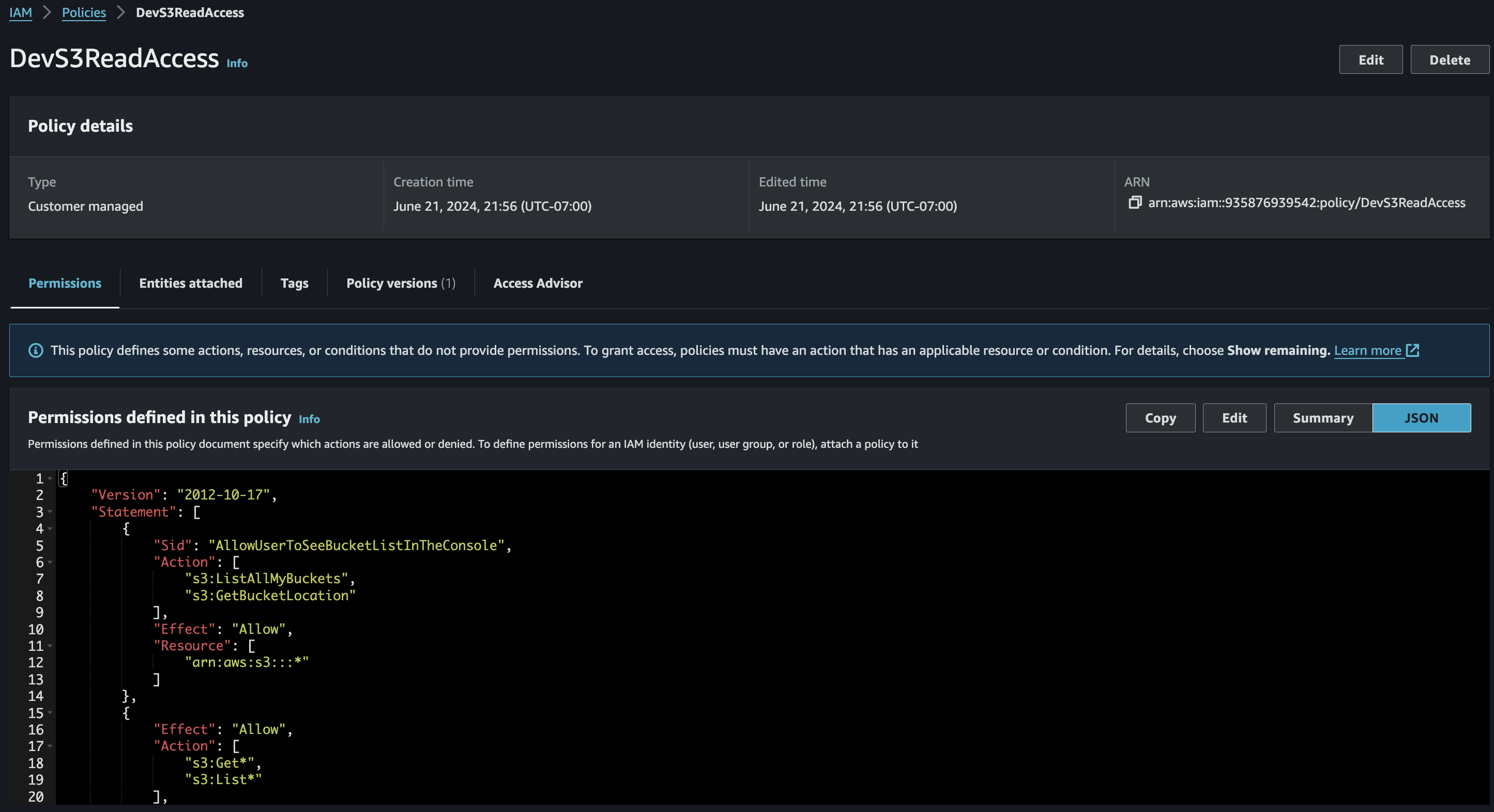 [cloud_user@ip-10-0-1-152 ~]$ aws iam create-policy --policy-name DevS3ReadAccess --policy-document file://dev_s3_read_access.json
