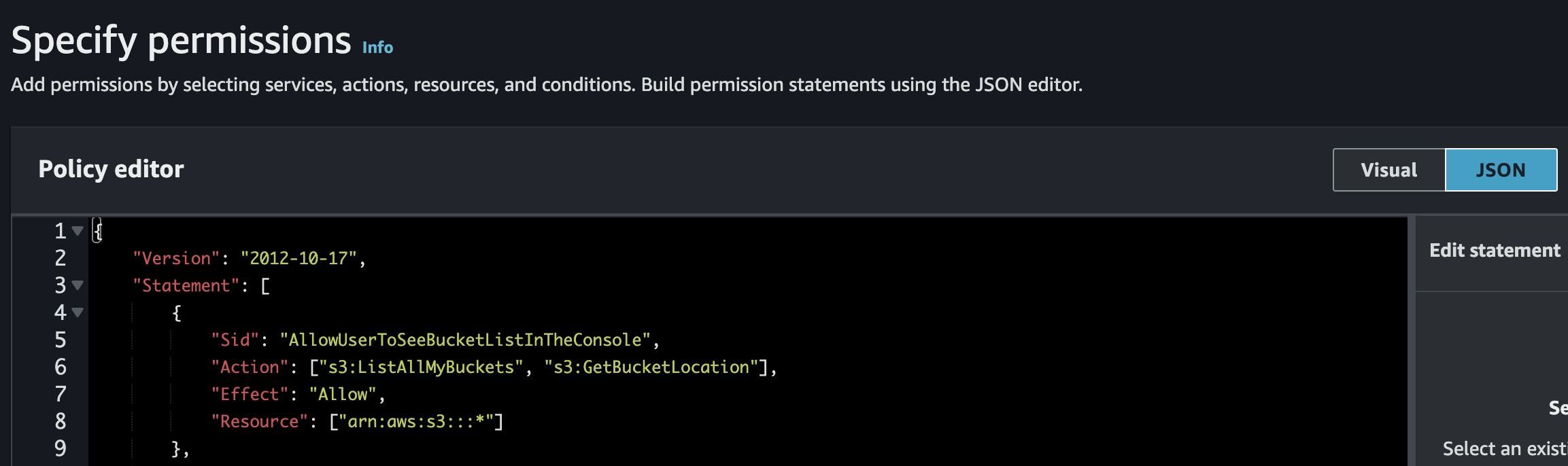 "Sid": "AllowUserToSeeBucketListInTheConsole",