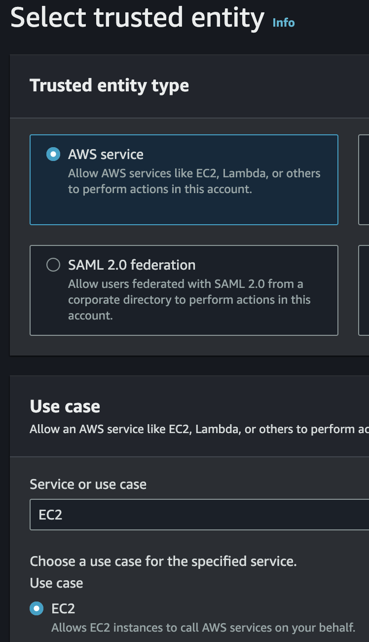The IAM Role is created with the Trust Policy associated which gives to the EC2 service permissions to assume the role.