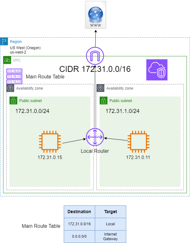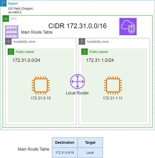 The diagram shows two EC2 instances on different AZs. Both Subnets are attached to the Main Route table so communication between both EC2 instances is possible.