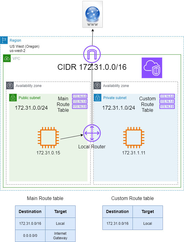 In addition to the Main Route table, a Custom Route table can optionally be created. In this diagram, since the Custom Route table does not have a 0.0.0.0/0 route to the Internet Gateway (IGW), the EC2 instance with IP address 172.31.1.11 cannot have access to the Internet.