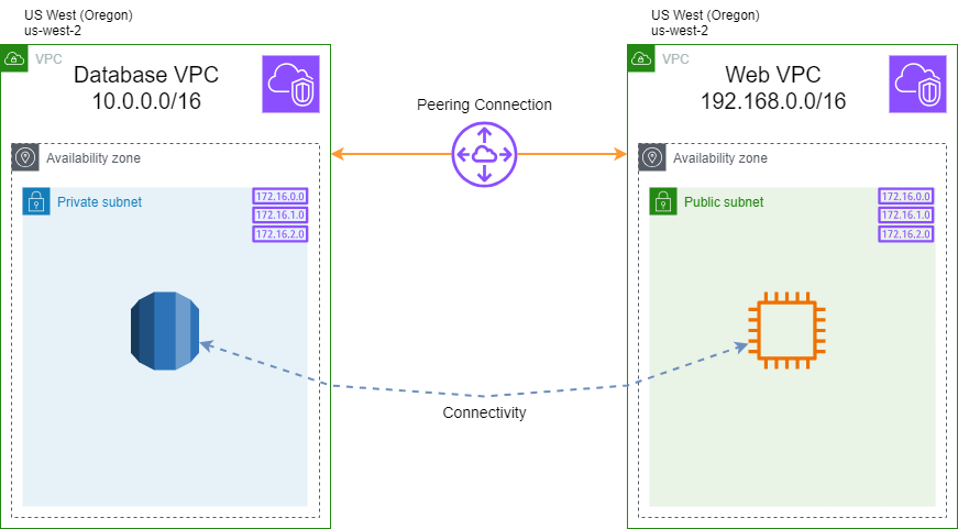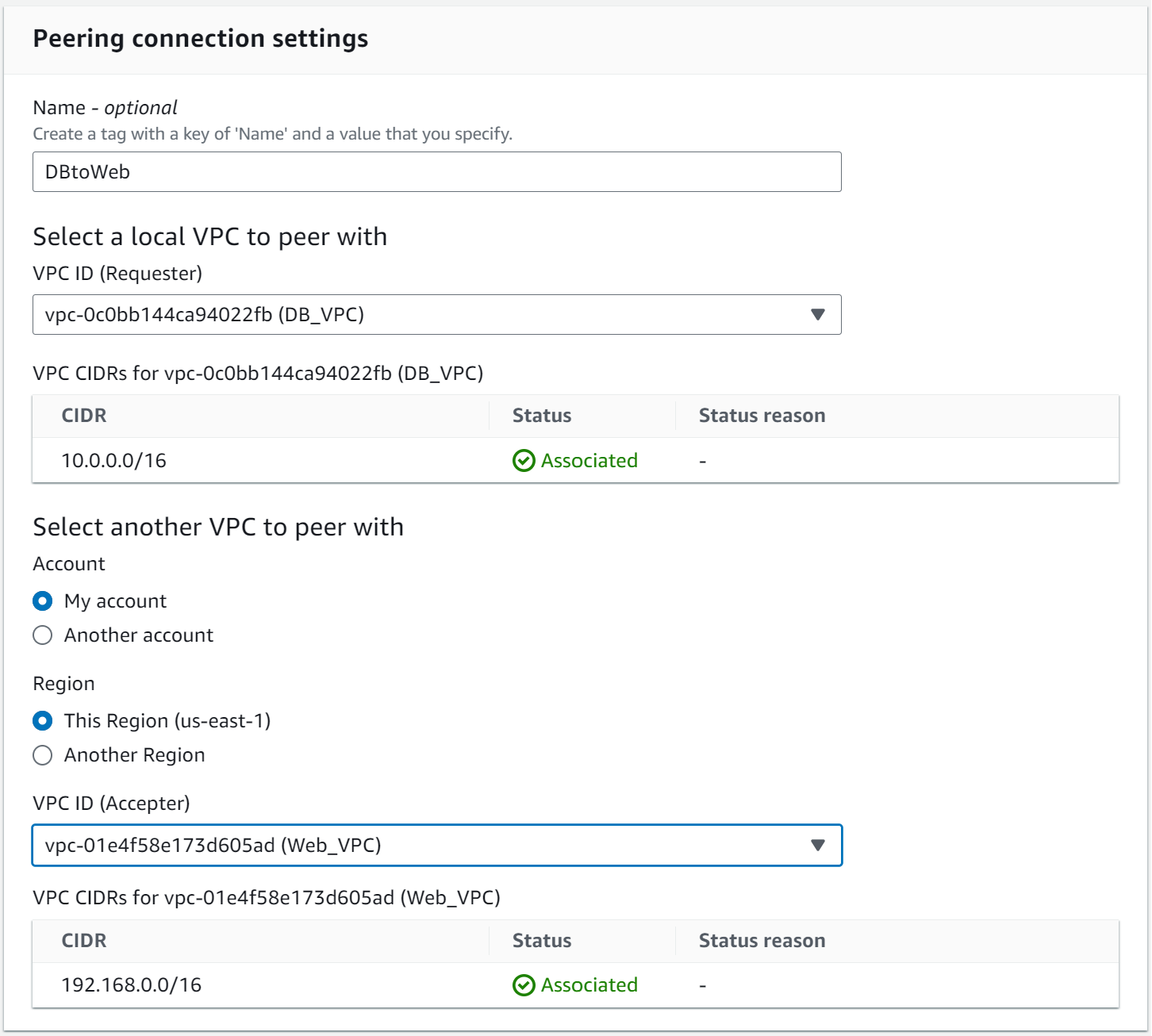 - CIDR block must not overlap with existing CIDR or peered VPC CIDR