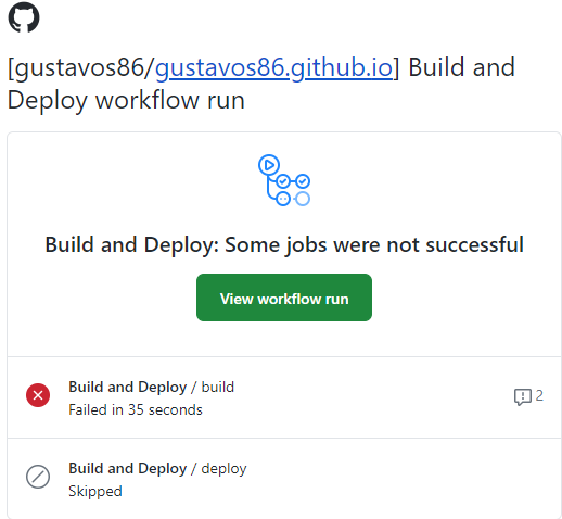 Today, after a commiting a new entry and pushing it to GitHub, I received the usual email I got when something went wrong with the build & deploy process.